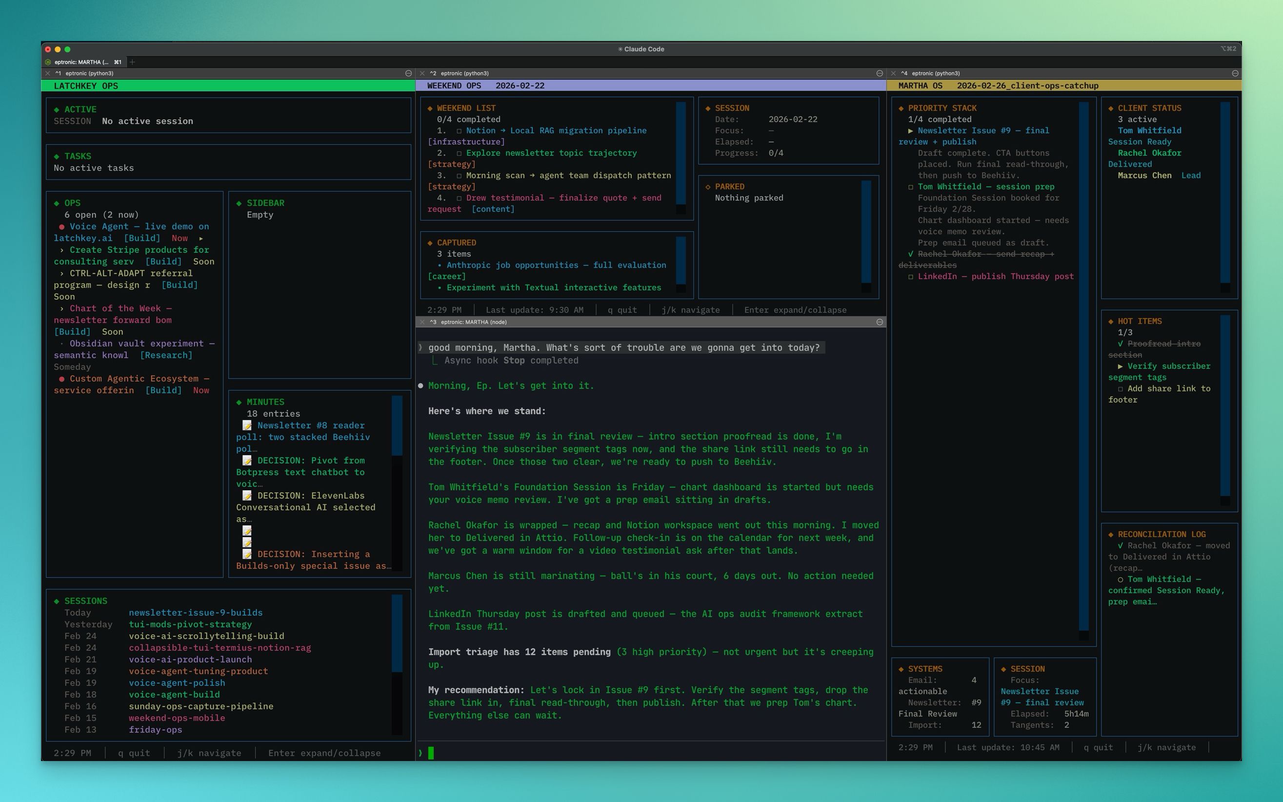 Since then my business launched and things got real. A weekly newsletter publishing cadence. A CRM to track consulting clients. Email across multiple inboxes. An ops list that kept growing. Content pipeline. Client session prep. Follow-up sequences. I was spending more time switching between tools than doing the actual work.