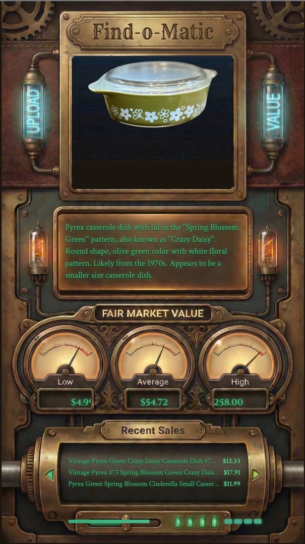 A piece of Pyrex doesn't come back as "vintage glass dish." It comes back as "1970s Pyrex Butterfly Gold casserole dish with lid, 2.5 quart." That specificity is what makes the next step work.