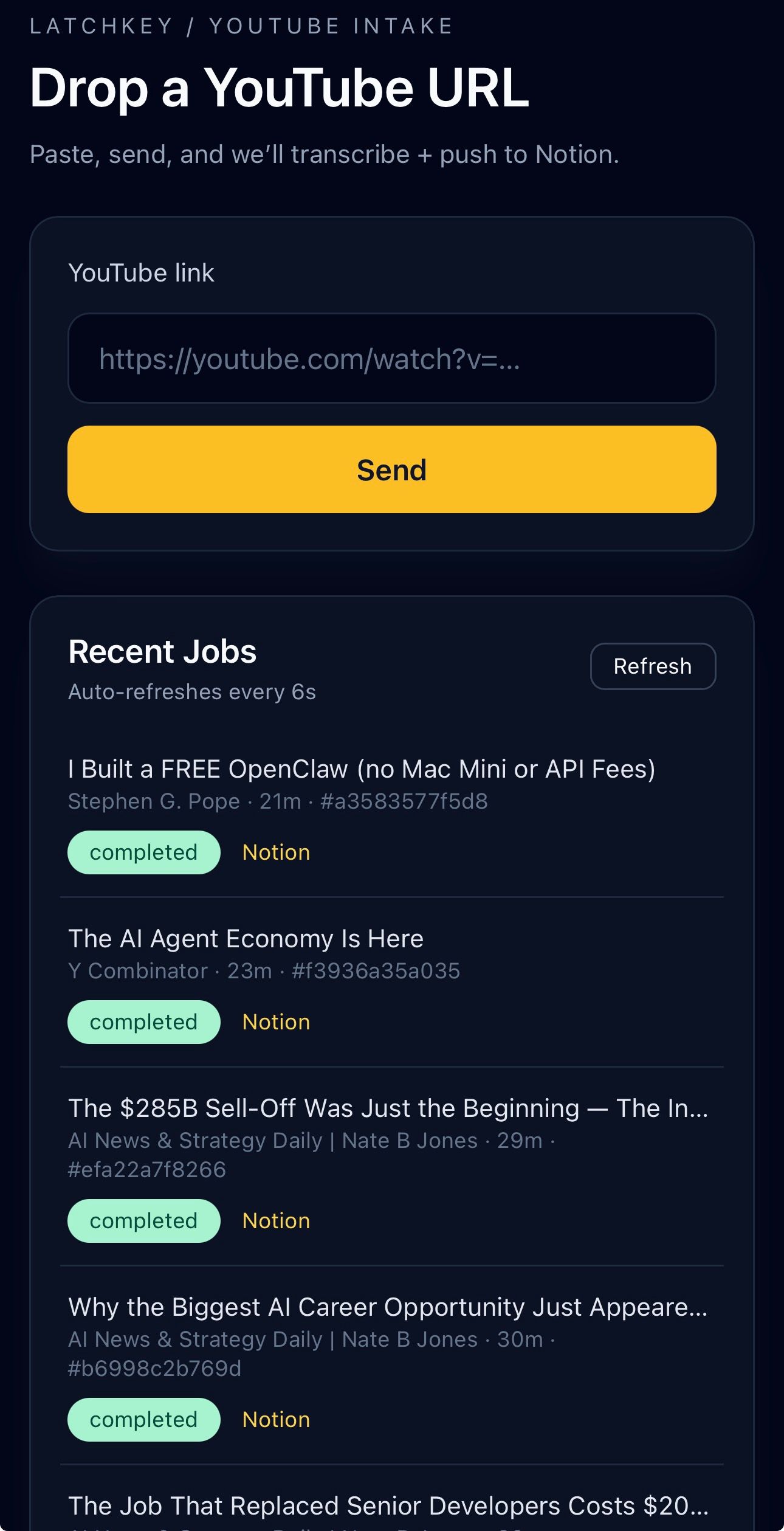 The architecture was sound, but YouTube has this little dance they do, periodically rotating some wiring under the hood that breaks the yt-dlp piece. It’s an easy fix. Takes a few seconds really. But knowing when you need it is unpredictable. I didn’t realize until I checked my Notion database a couple weeks later and a bunch of videos I thought I transcribed weren’t there. Not cool. But a clear problem.